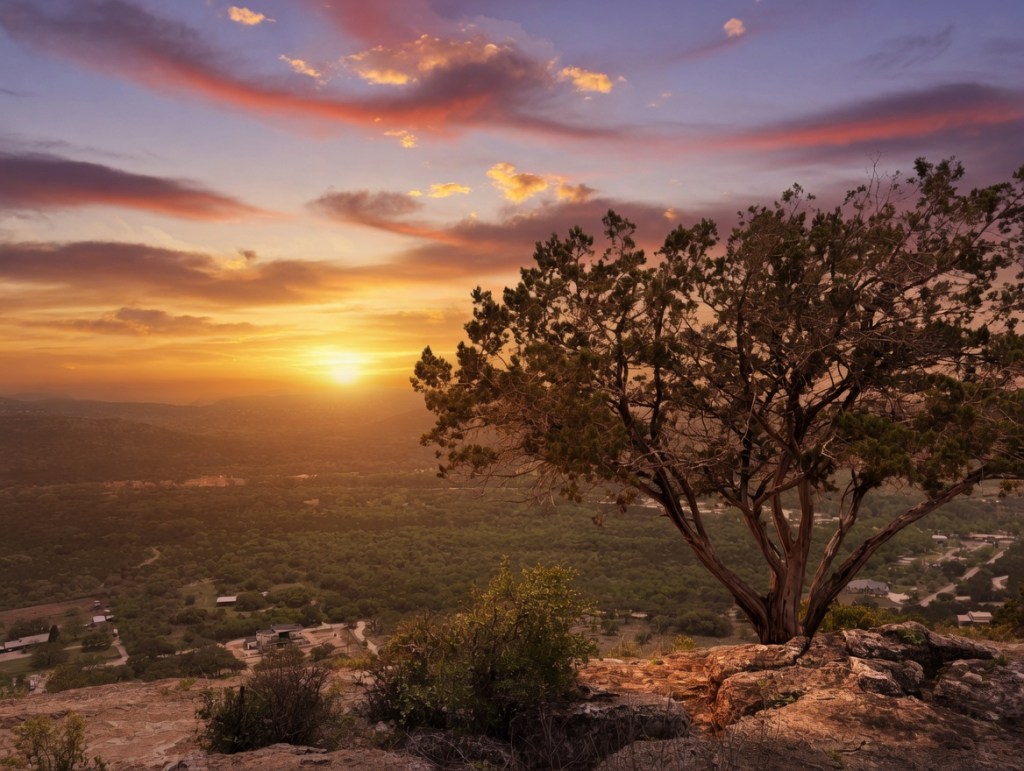 The road climbed upward, winding into the hills, and the city quietly fell away behind her. She passed by fields littered with scattered live oaks, their twisted branches offering reprieve from the hot Texas sun. As the road wound higher, the oaks were replaced with Ashe junipers clinging tightly to a rocky terrain.